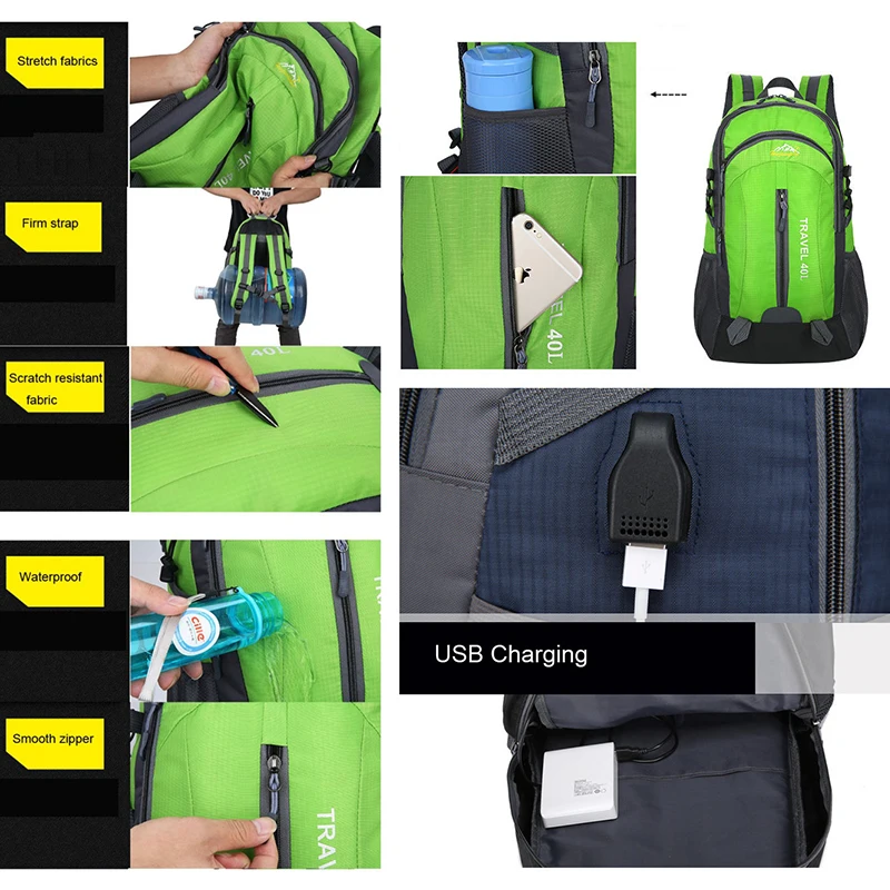 40L Waterproof travel Hiking Backpacks for Men Male Uni Sport Bag Pack USB Outdoor Mountaineering C